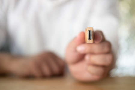 Miniature people businessman standing on wooden USB stick. Analysis or investment Blockchain concept and cyber security concept