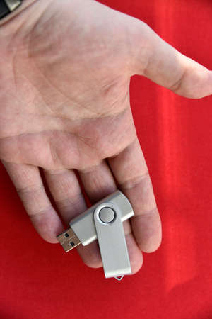 Close-up of male hand holding usb flash adapter for sd card isolated on background of red color.