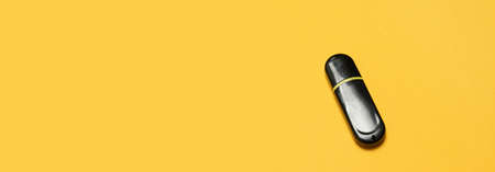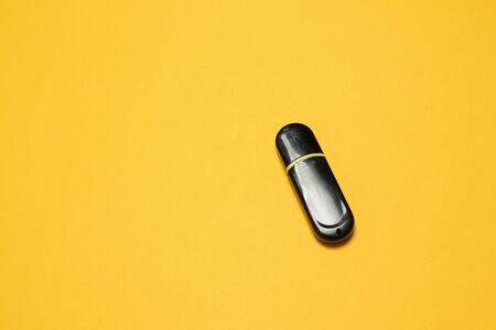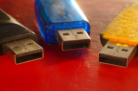 USB flash drive - black, yellow and blue, on a red background. Three used computer flash drives, ready to work. Close-up of a data memory stick, in several colors, on a bright background.