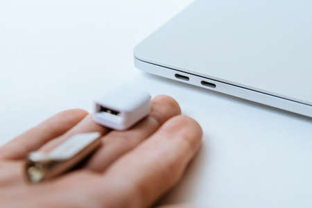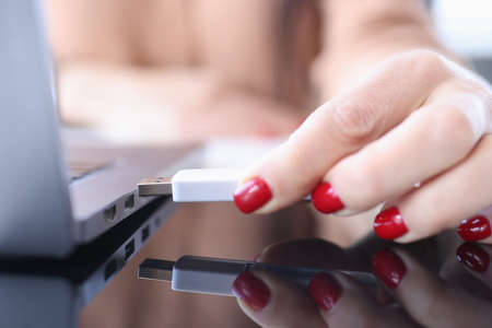 Close up of a woman hand connecting a pendrive in a laptop on a desktop