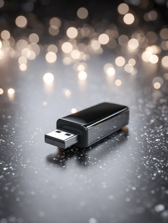 A modern, glossy black storage gadget with a shiny metal plug rests on a mirrored surface, illuminated by gentle, colorful sparkles capturing a celebratory mood.