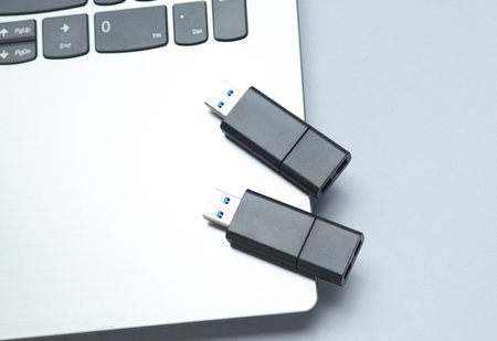 Two black USB flash drives and laptop keyboard gray background. Top view