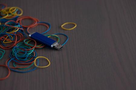 Close up shot of multi colored rubber bands, blue usb flash drive, flash card