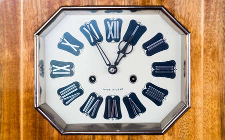 Old clock with Roman numerals. Made in USSR. Into a wooden box.