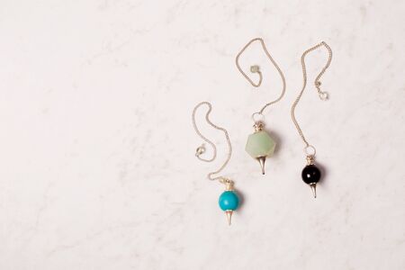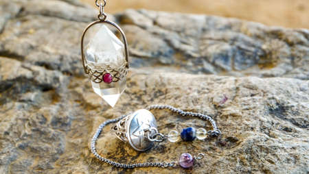 holding and using quartz crystal pendulum and using it In asking questions. pendulum quartz on stone background.