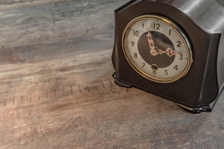 An antique alarm clock with a golden finish and intricate details sits on a dark surface, its face showing the time just past midday.