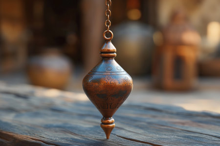 Golden pendulum hanging over a wooden table, creating a spiritual atmosphere