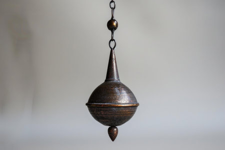 Old bronze plumb bob hanging on a chain is isolated against a light grey background