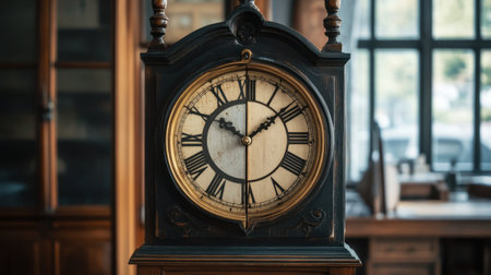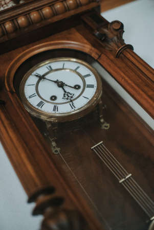 Antique wooden clock featuring Roman numerals and delicate clockwork, set in a warm and inviting interior space, perfect for adding a touch of vintage charm to any decor.