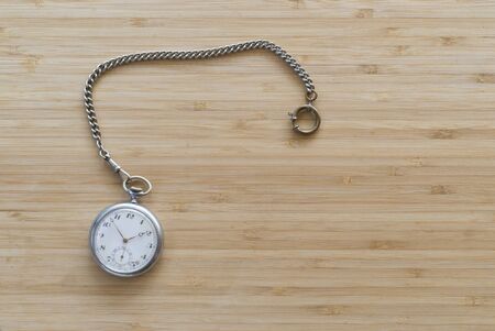 Pocket watch on a chain on a blue background. The view from the top. The concept of time.