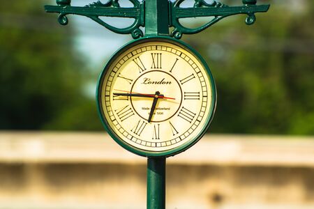 Antique clock hanging and showing five minutes to seven oclock with a blurred background