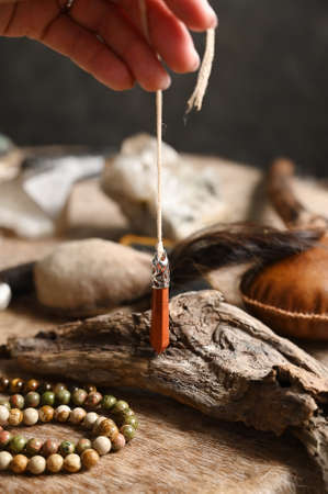 Woman's hand with a pendulum for performing a ritual against the background of shamanic accessories