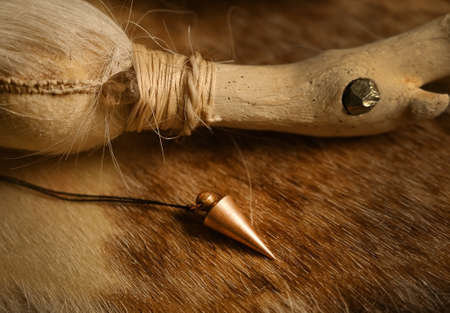 The pendulum for reading the future lies on the skin with shamanic attributes