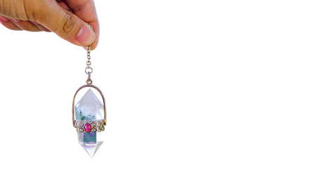 holding and using quartz crystal pendulum and using it In asking questions. Quartz Crystal Pendulum Hanging over a Hand