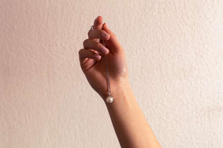 Woman's hand holding silver necklace with pearl pendant, painted short nails, close-up. Horizontal photo.