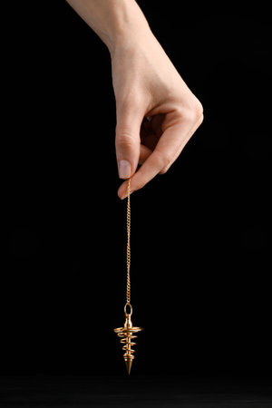 Psychotherapist with pendulum on black background, closeup. Hypnotherapy sessions