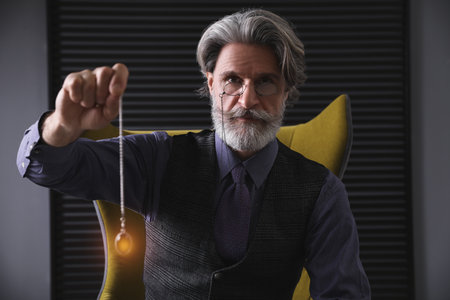 Hypnosis session. Man in glasses swinging pendulum indoors