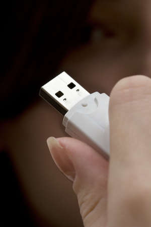 Woman's hand connects design aluminium pendrive to modern ultrabook.