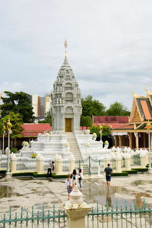 Phnom Penh, Cambodia - February 11, 2017: White stupa on the grounds of Silver Pagoda complex, a Buddhist temple inside the Royal Palace of Cambodia