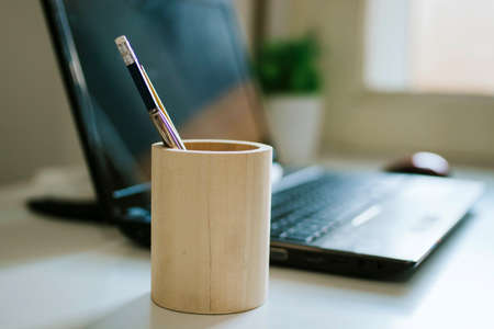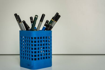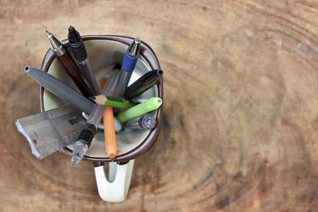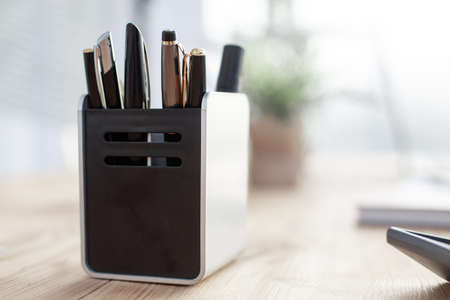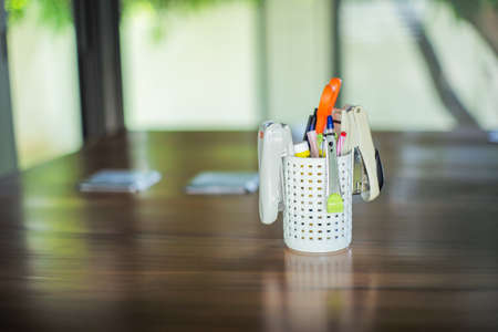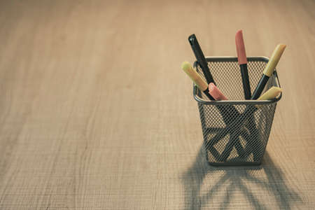 Closeup color pen with black ceramic desk tidy for pen on blurred wooden desk and frosted glass wall textured background in the work office
