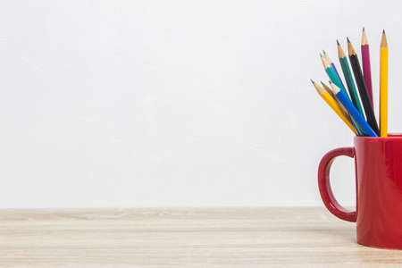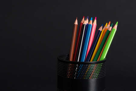 Black holder with colored pencils. Office and teaching supplies. wooden table and a white background. Copy space