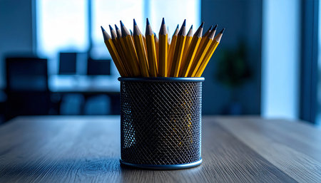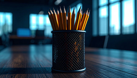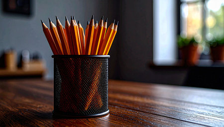 Closeup of sharpened yellow pencils standing upright in a metallic mesh pencil holder, placed on wooden desk with natural daylight, minimal school supplies concept