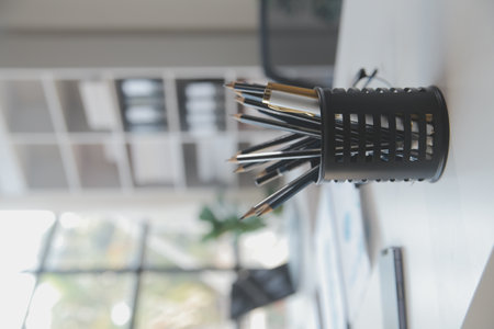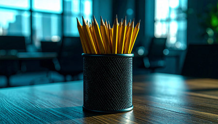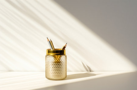 This image features a stylish metal pencil holder filled with various stationery items, casting interesting shadows on a sunlit desk. Perfect for depicting a creative and organized workspace.