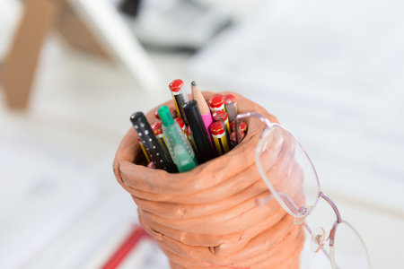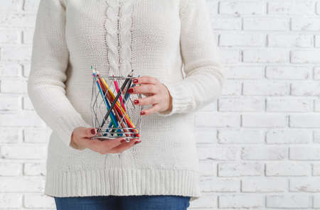 closeup caucasian young female hands inside an office taking colored markers from the pen holder, copy space