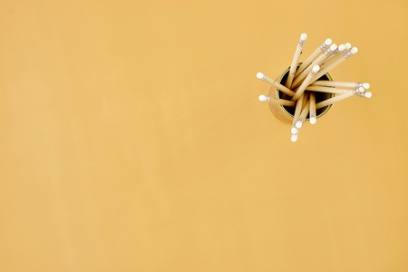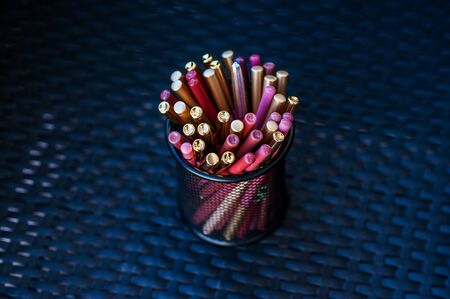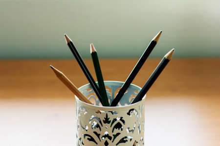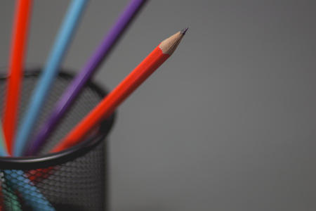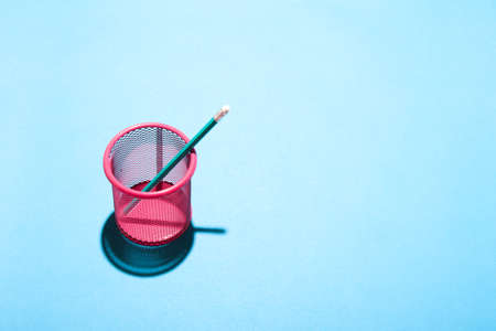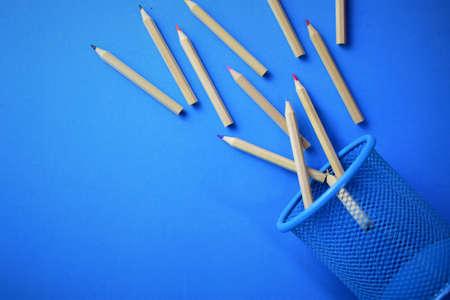 Pencil stand with pencils. office supplies. Flat lay, top view.