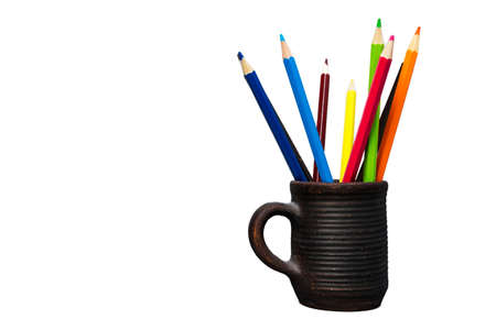Colored funny pencils in a clay cup Isolated on a white background, Colored pencils in a clay cup. Drawing Tools