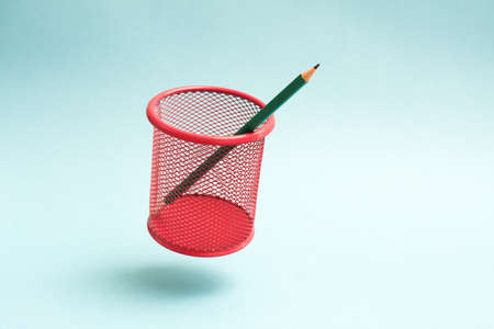 Flying red mesh pencil cup with a single pencil. Green pencil in a flying cup.