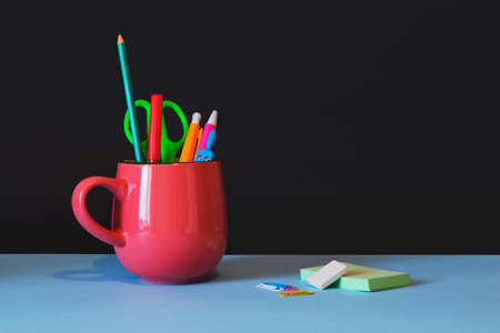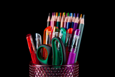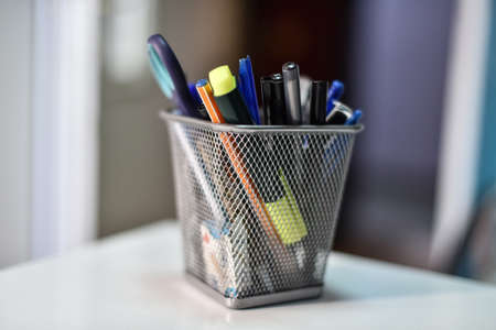 Pencils, pens, scissors in a stand. Office supplies, close-up, selective focus.