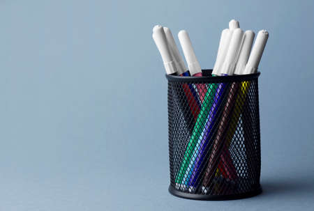 a group of colored markers in a plastic container. Creativity and drawing. Selective focus.