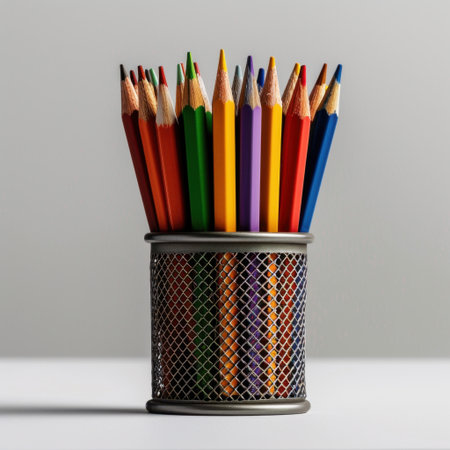 A vibrant collection of colored pencils neatly arranged in a mesh container, perfect for artistic projects, educational settings, or modern office decor.