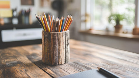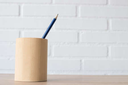 cylindrical pen holder made of solid wood on a white surface with text space with pencils