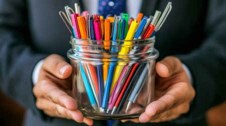 Businessman showing a glass jar filled with colorful pens and paper clips