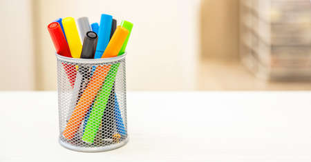 Colorful markers set in a holder on student desk, blur room interior background. Education, back to school, kids creativity concept. Copy space, template