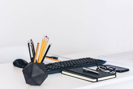 modern workplace: white table, keyboard laptop computer, concrete holder with pencils and pens, notebook, smartphone, glasses, education office concept background