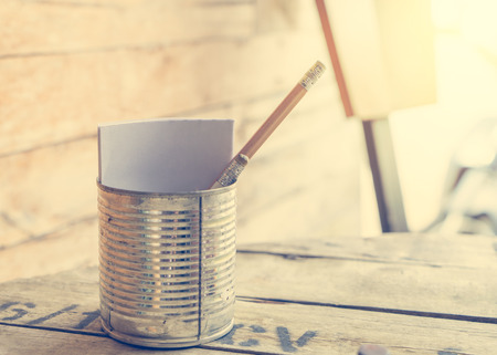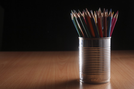 A variety of coloured pencils in an old metal tin on a wood plank desk with copy space to left and above. Filtered for retro effect.