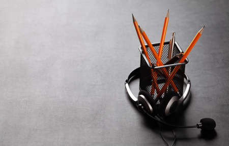 Office desk with headset and supplies. Remote office and work from home concept. With copy space
