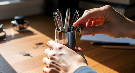 A person's hands reach to select a pen from a cylindrical metal holder filled with various pens on a wooden desk. Sunlight casts strong shadows across the workspace, which includes notebooks and ink, suggesting a moment of creative or professional focus.
