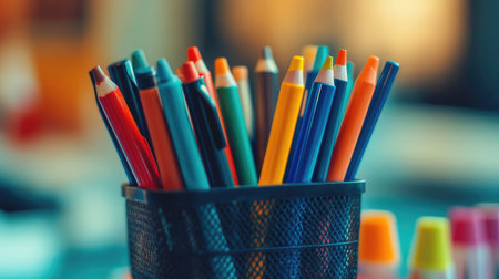 Detailed shot of a pencil case filled with an assortment of colored pens and markers, with a soft, blurred background