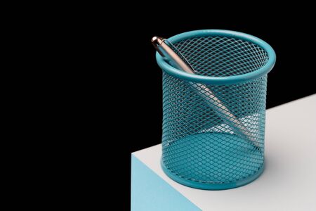 Hand holding office organizer box for keep pen and pencil in holder basket made of metal grid on white background
