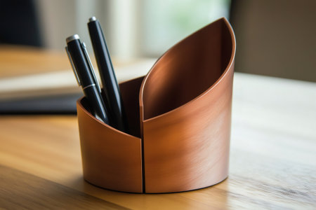 Stylish copper pen holder with two pens sitting on a wooden desk, perfect for a modern office or workspace