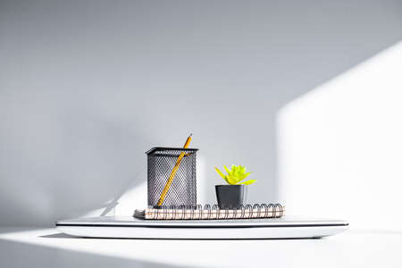 Comfortable workplace. Potted plant, pencil holder and coffee cup on white office desk.