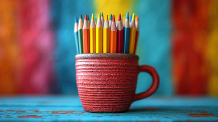 Colorful pencils in a cup on a wooden background. Selective focus.