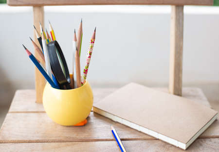 Colorful group of pencil with notebook on wood table.Back to school concept.