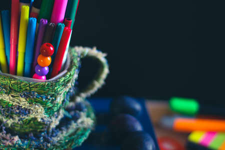 Color pencils and pens on the background of a dark school blackboard. On the board place