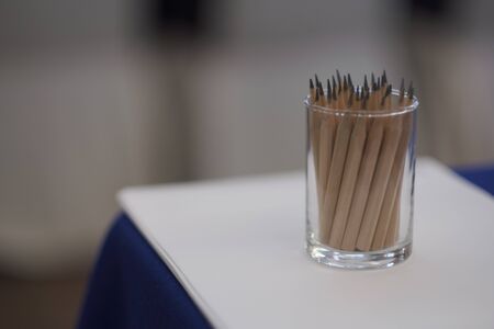 Glass Cup with brown and black pencils on the glass table. Close up. Copy space.