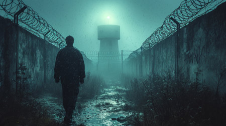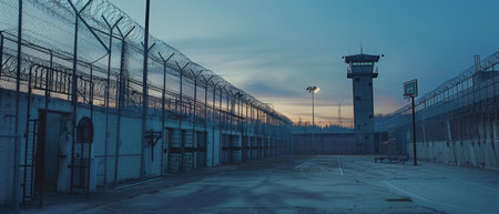 The sharp barbed wire stretches across a prison fence, creating an imposing barrier. Shadows deepen as dusk settles around the area, highlighting the stark reality of confinement. The composition evokes a feeling of isolation and security, emphasizing the harsh surroundings of the facility.